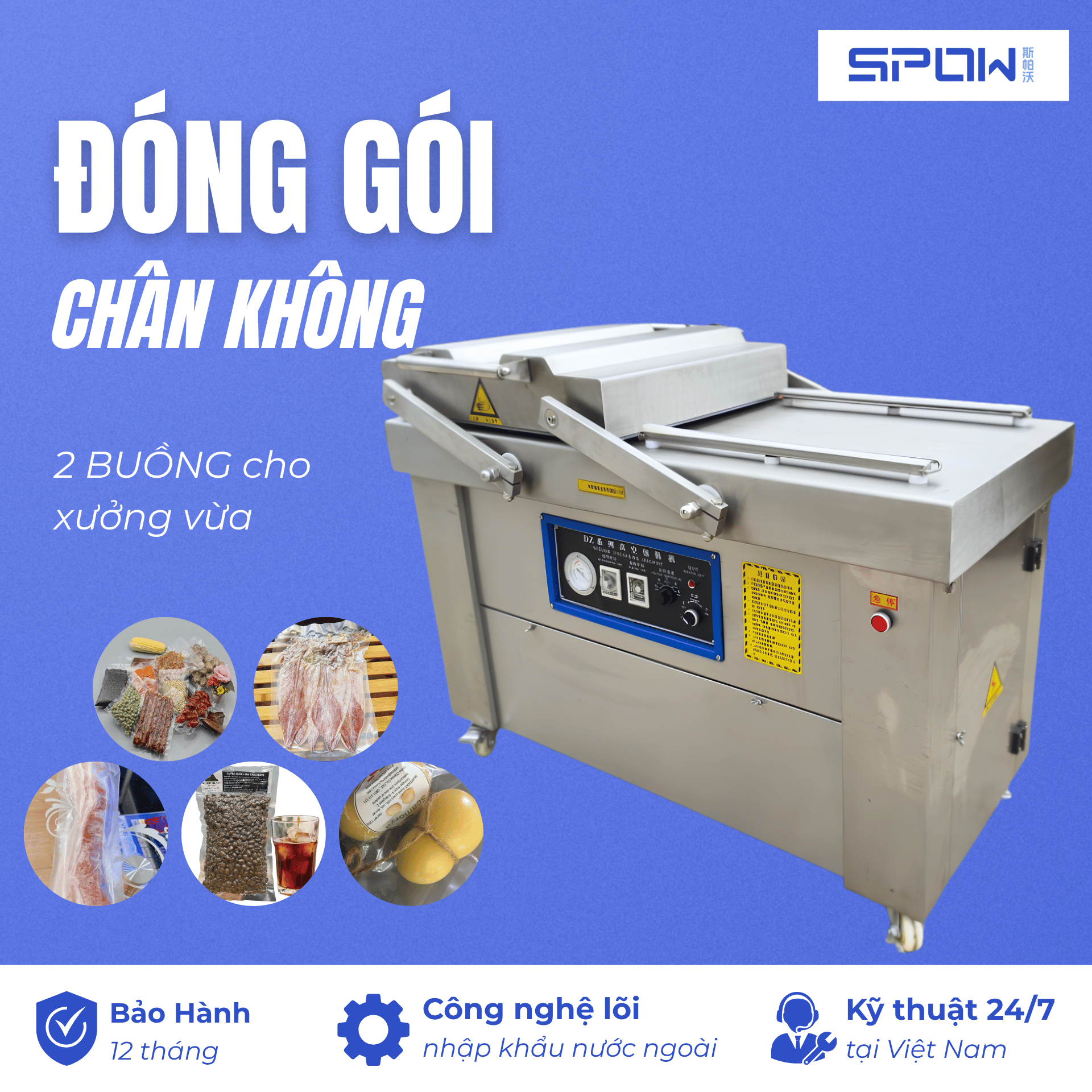 Máy đóng gói hút chân không 2 buồng là thiết bị trong hệ thống máy chế biến thực phẩm, phù hợp cho sản xuất liên tục tại xưởng quy mô vừa và lớn. Thiết kế 2 buồng cho phép một bên hút – hàn trong khi bên còn lại xếp sản phẩm, giúp giảm thời gian chờ và tăng tốc độ đóng gói.